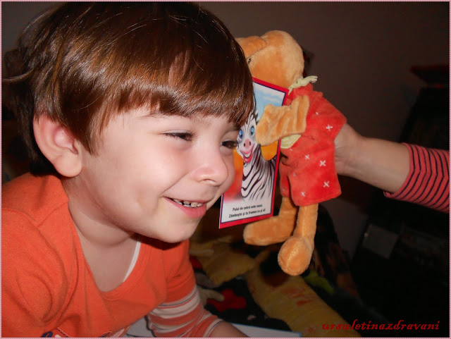 Am facut un mic teatru de papusi. Un iepuras isi chema pe rand prietenii care faceau tot felul de minunatii. A. trebuia sa faca exact ca si ei. Nu toate exercitiile au fost usoare pentru noi.