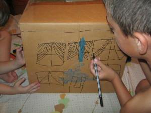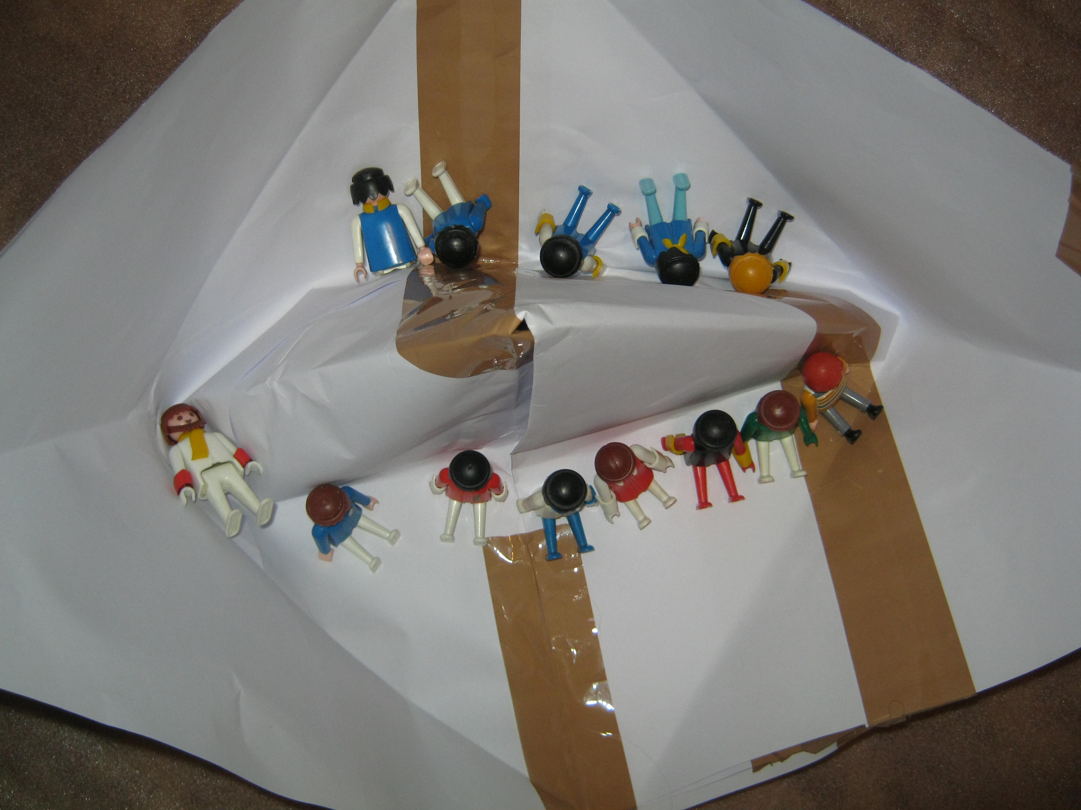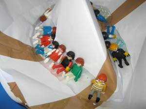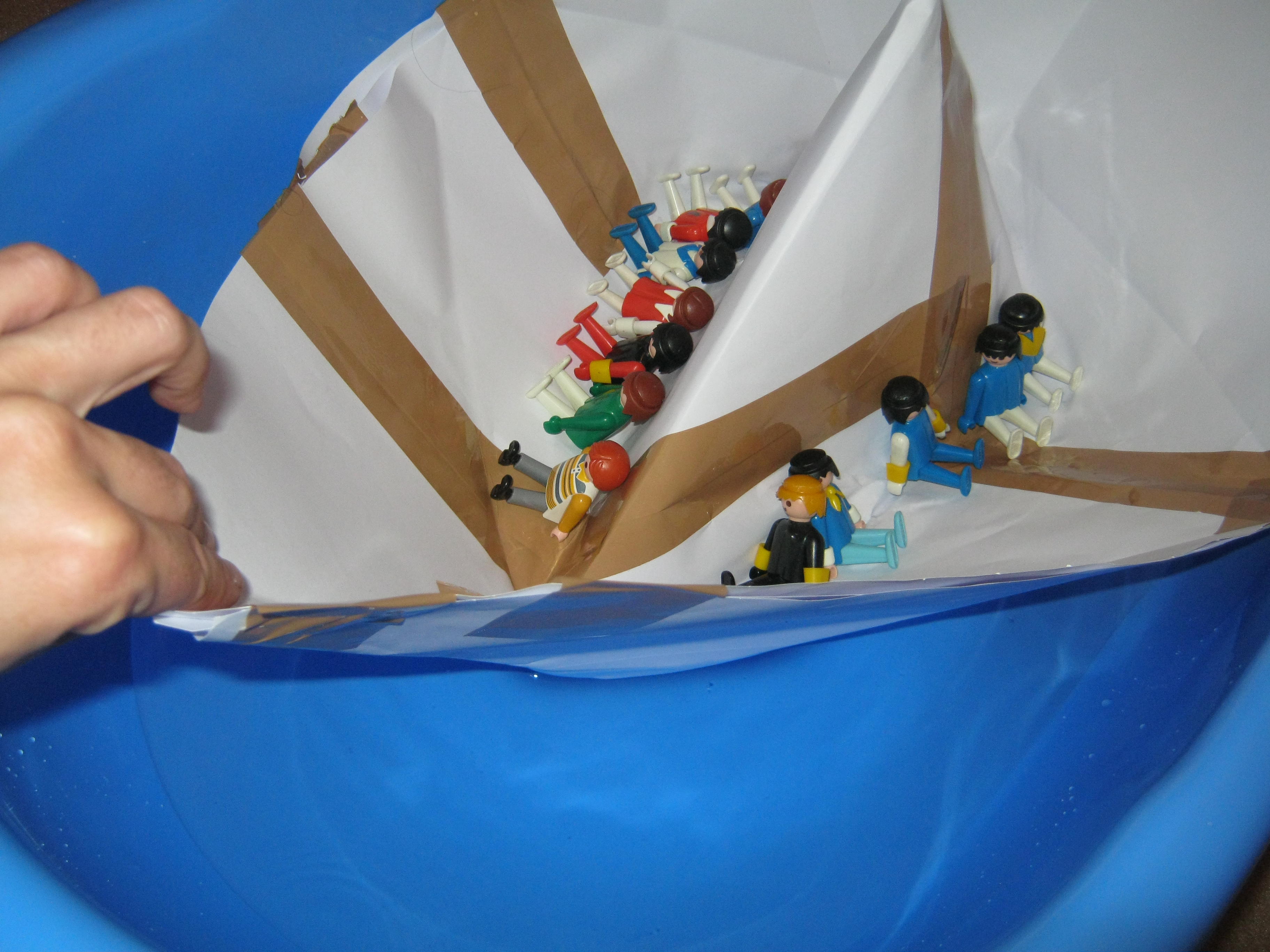 Am facut dinainte pentru fiecare copil o macheta mai mica a barcutei. Vasla era prinsa cu velcro. FIgurinele se prindeau tot asa cu scai.
