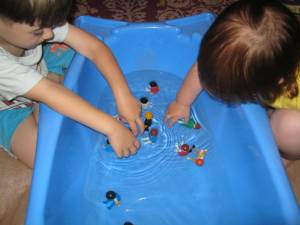 Puneam o intrebare fiecarui copilasi si dupa ce raspundea, venea si putea sa isi ia un pestisor din navod (sigur pestisorul era al lui ). Pentru ca stiti si voi, cei mici se cearta: eu vreau roz, ba eu vreau roz, eu rosu, etc….le-am spus ca atunci cand vor scoate pestisorii din navod sa inchida ochisorii. SIgur, au facut ceva schimburi intre ei dupa aceea, dar nu s-au mai certat. 🙂