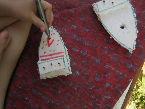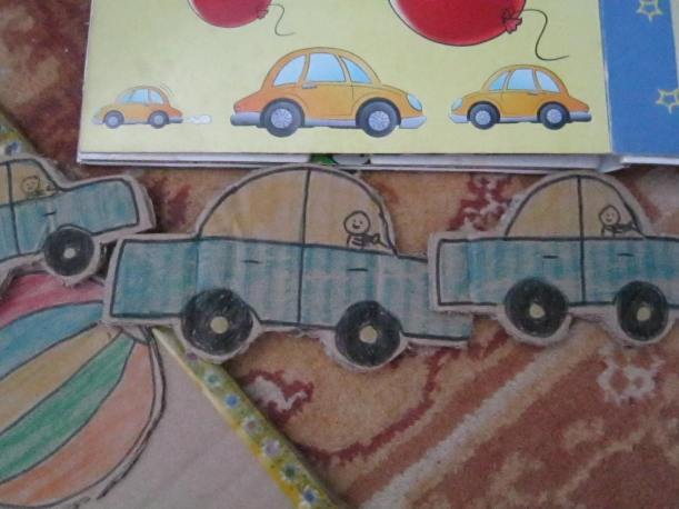 Le-am colorat si dupa aceea le-am decupat cu cutterul. Constat ca trebuie sa-mi cumpar un nou cutter :)…de-abia am reusit sa decupez acolo unde erau liniile curbe. In fiecare masinuta, sofer era tati…aceasta a fost cerinta lui A. IN orice masina desenata de noi, imi arata:”aide, acum fa tati”…dupa aceea, imi arata ferestrele din spate:”si D….si Aecs…si mami” 🙂