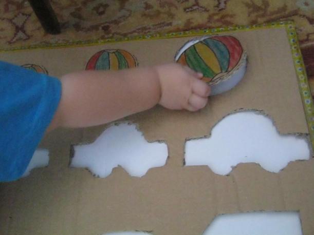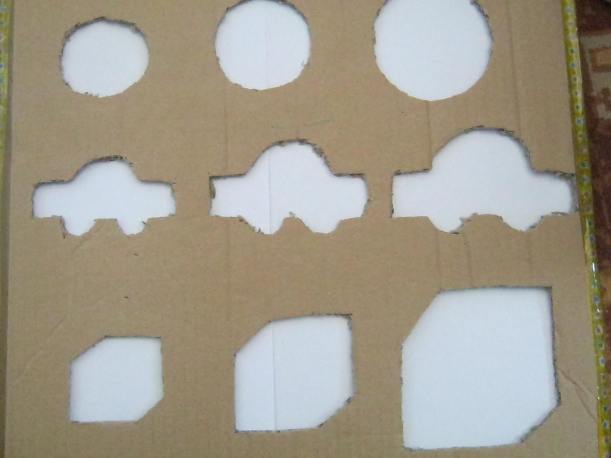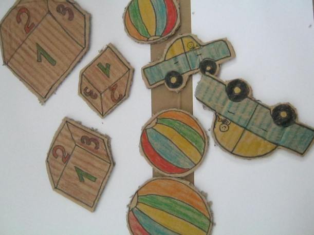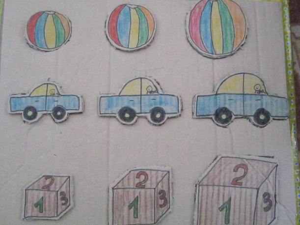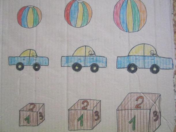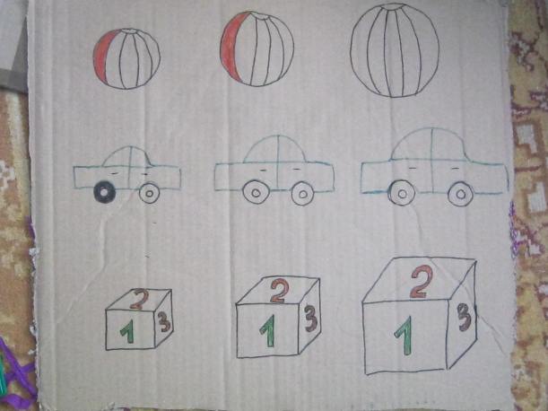 Am decupat o parte patrata dintr-o cutie din carton gros. Am desenat obiectele: o minge, o masina si un cub de diferite dimensiuni.
