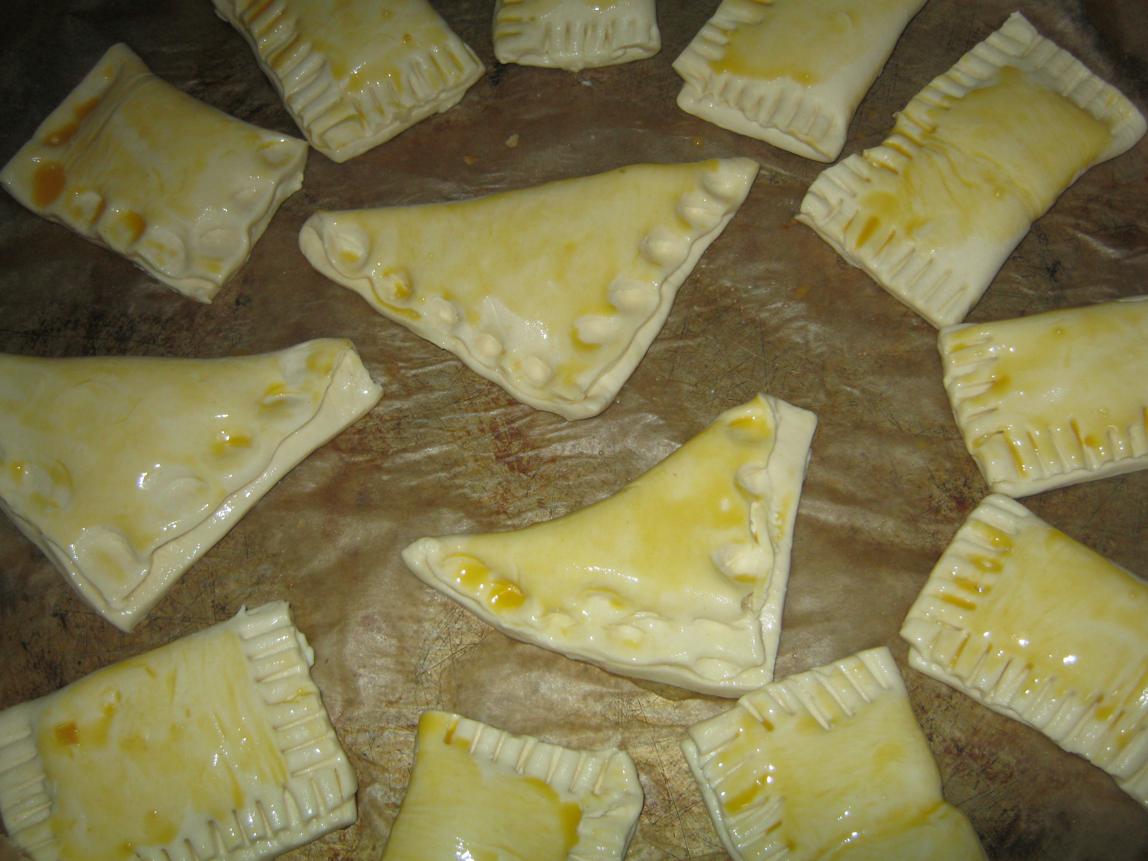 Am taiat aluatul in patrate (mi-au iesit 18). Am facut triunghiuri sau pernute. Am pus cate o lingurita din umplutura cu branza. Triunghiurile le-am apasat cu degetele si pernutele dreptunghiulare cu furculita (ca sa nu iasa compozitia din ele.