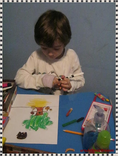 Il vad cum contureaza repejor un copac….si recunosc ca ma asteptam la inceput sa-i dea o alta forma. L-am lasat in pace ca sa nu-l influentez deloc. Cand ma intorc, D. desenase un copac de poveste! :))