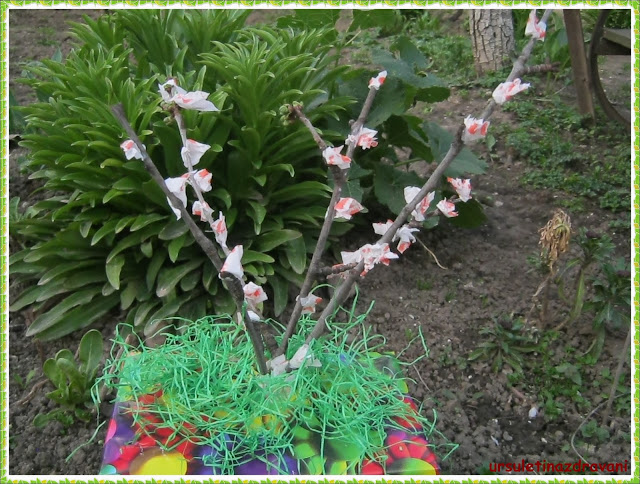 Cerinta primei probe a fost simpla: sa adunam niste crengute si sa le transformam intr-un copacel, aplicand pe acestea flori din hartie creponata.